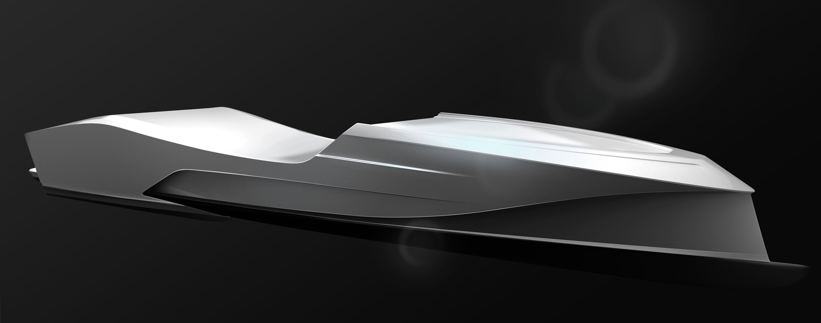 Slender main hull increases efficiency to the extent that we were able to use an entirely smaller series of engines. Reduced fuel burn. Sponsons add stability at rest and at speed.